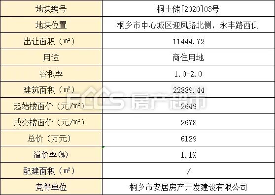 最终,地块由桐乡市安居房产开发建设有限公司以总价0.613亿元竞得,楼面价2678元/㎡,溢价率1.1%